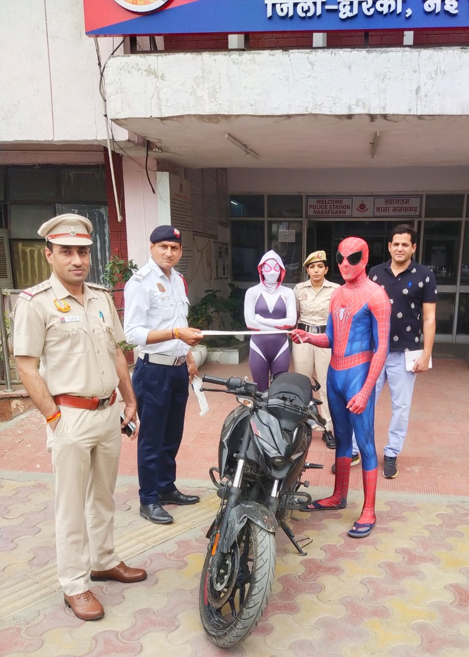 दिल्ली :एक युवक और उसकी दोस्त ने बगैर नंबर की बाइक पर बगैर हेलमेट के स्पाइडर-मैन की वेशभूषा में स्टंट करते हुए सड़क पर खूब बाइक दौडाई यह वीडियो वायरल भी हुई. सोशल मीडिया पर एक वीडियो वायरल हुआ था, जिसमे एक व्यक्ति बिना हेलमेट के बिना नंबर प्लेट की बाइक दौड़ा रहा था। वह यूईआर-II पर स्पाइडरमैन की वेशभूषा में स्टंट कर रहा था। स्टंटबाज़ की सवार की पहचान आदित्य पुत्र रोहित वर्मा निवासी आरजेड 57, मकसूदाबाद कॉलोनी, नजफगढ़, नई दिल्ली, उम्र 20 साल के रूप में हुई और उसके साथ उसकी दोस्त अंजलि पुत्री नंदकिशोर निवासी 87ए, गोपाल नगर, नजफगढ़, नई दिल्ली, उम्र 19 साल थी। सवार पर बिना हेलमेट, बिना शीशे, बिना लाइसेंस, खतरनाक तरीके से वाहन चलाने और नंबर प्लेट न दिखाने आदि के लिए धारा 5/180, 194डी, 3/181, 177, 125(2) सीएमवीआर/177, 184 एमवी एक्ट, 50,51 सीएमवीआर/39/192 एमवी एक्ट मे चालान किया गया।