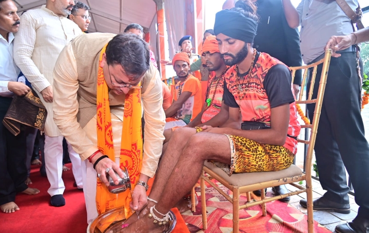 मुख्यमंत्री के निर्देश पर हरिद्वार में कांवड़ियों पर आसमान से हेलीकॉप्टर के जरिए पुष्प वर्षा कर उनका स्वागत किया गया। धामी ने यहां पहुंचकर कांवड़ियों के चरण धोकर उनका सम्मान किया। उन्होंने शिवभक्तों को माला पहनाई और उन्हें फल प्रदान किए।हरिद्वार में जारी कांवड़ यात्रा के दौरान शिव भक्त कांवड़ियों पर हेलीकॉप्टर के जरिए पुष्पवर्षा की गई और मुख्यमंत्री पुष्कर सिंह धामी ने उनके चरण धोकर उनका सम्मान किया। धर्मनगरी हरिद्वार में इन दिनों चारों और भगवा बाना पहने कांवड़ियों की चहल पहल है और हर तरफ ‘बोले बम’ और ‘हर हर महादेव’ का नारा गूंज रहा है। रोजाना हजारों की संख्या में कांवड़िए हरिद्वार में गंगा जल लेने के लिए आ रहे हैं।इस अवसर पर सीएम धामी ने मीडिया से बातचीत करते हुए भगवान शिव के भक्तों की सेवा और सम्मान का मौका मिलने पर स्वयं को सौभाग्यशाली बताया और कहा कि यह बहुत पवित्र, पौराणिक और कठिन यात्रा है जिसमें शिव भक्त सैकड़ों किलोमीटर की पैदल यात्रा करके पवित्र गंगा जल लेने यहां आते हैं और पैदल ही अपने गंतव्य तक पहुंचकर भगवान शिव का जलाभिषेक करते हैं।